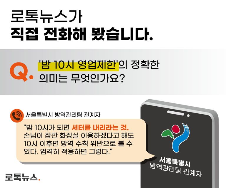 결론부터 말하면, 업주 A씨 입장에서는 다소 억울할 수 있어도 방역수칙 위반이다. '밤 10시 영업제한'은 ①손님의 경우 식당에서 퇴장하고 ②업주는 영업을 종료한다는 의미라고 서울시 시민건강국 감염병관리과 관계자는 말했다. 즉, 손님이 식사를 마친 상태라고 해도 10시 이후에 식당에 머물러도 되는 건 아니다.