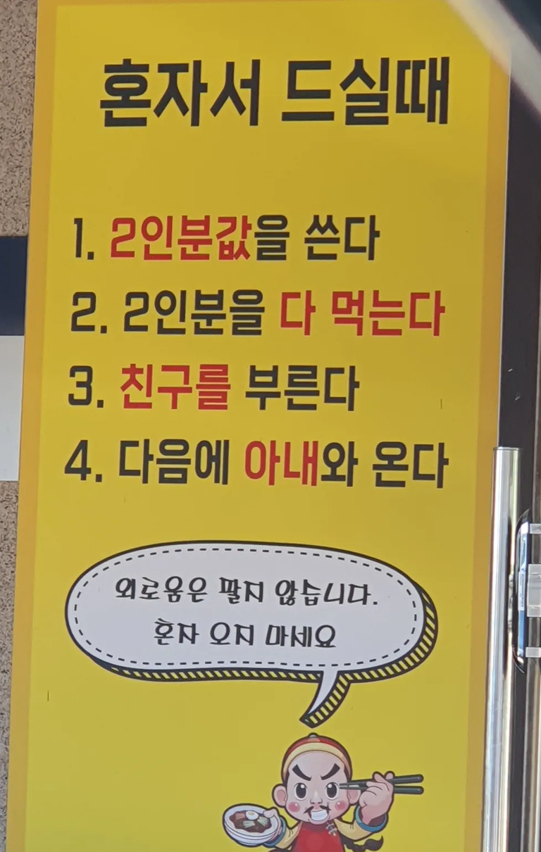 결론적으로, 혼밥 거부는 손님의 기분을 상하게 하고 사회적 비판을 받을 순 있으나, 현행법상 식당 주인을 처벌하거나 강제할 뚜렷한 방법은 없는 셈이다.