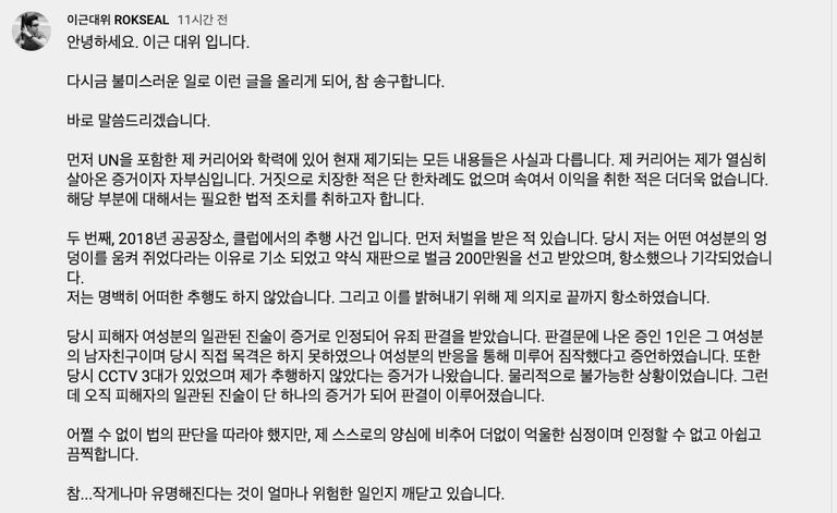 유튜브 콘텐츠 '가짜사나이'에 출연해 화제가 된 이근(36) 예비역 대위. 그가 과거 성추행 전과에 대해 "처벌받은 적은 있지만, 명백히 어떠한 추행도 하지 않았다"는 주장을 펼쳤다.
