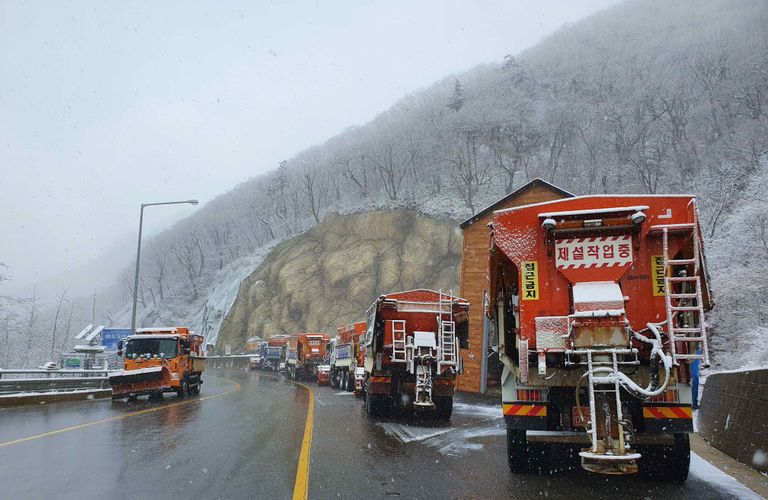 강원 산간에 눈이 내린 25일 양양과 인제를 잇는 한계령 정상에서 제설 차량이 줄지어 대기하고 있다. /연합뉴스