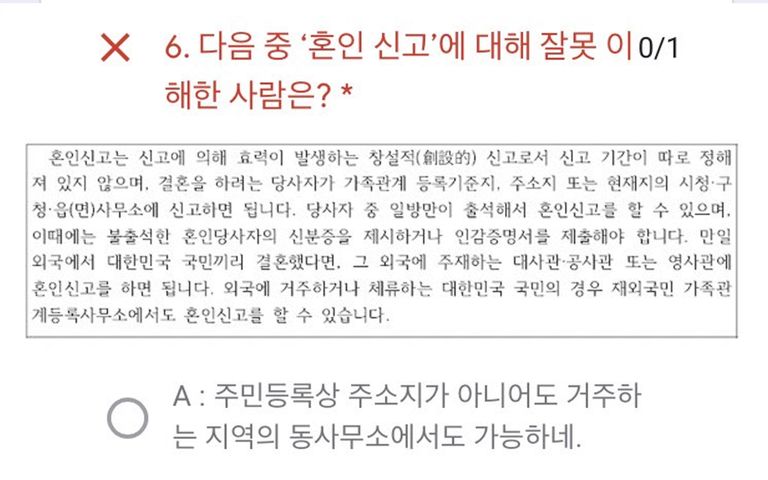 '혼인 신고'에 대해 잘못 이해한 경우를 맞추라는 질문이었고, 제시된 답안은 4개였다.