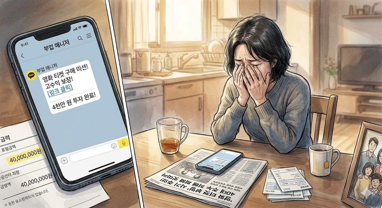 "부업하자"는 문자 한 통에 4천만 원을 날린 피해자. 영화 티켓을 구매하면 고수익을 보장한다는 미끼에 걸려들었다.