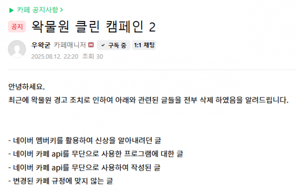 논란이 커지자 네이버 측은 해당 프로그램들을 차단하고 카페 운영자에게 경고 조치를 내렸다. 유튜버 우왁굳 역시 "카페 규모가 내가 관리하기에는 벅찬 부분이 있다"고 인정하며, 관련 글들을 모두 삭제하고 소속사가 직접 카페를 관리하는 방식으로 운영을 강화하겠다고 밝혔다.