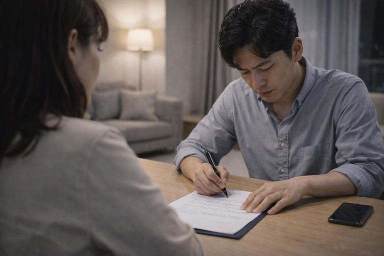 부정행위 후 관계 회복을 위해 작성하는 '전재산 포기 각서'는 법적 효력이 거의 없다. / AI 생성 이미지