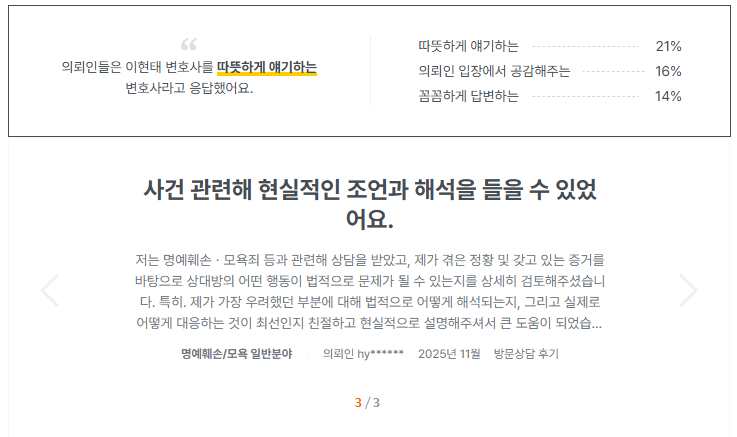 "의뢰인이 진심으로 개선의 의지를 갖도록 해주고, 이를 법원에 어필할 수 있도록 피고인신문을 진행하여 의뢰인이 개선의 여지가 충분하다는 점을 어필하였습니다."