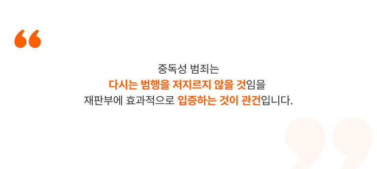 그는 치료계획, 향후 그 계획을 어떻게 이행할 것인지, 본인의 성향과 주변 환경 등에 비추어 이를 이행하기 위한 충분한 요건을 갖추고 있다는 점 등을 적절하게 언급해야 한다고 조언했다. 아울러 정형화된 양형자료 제출만으로는 한계가 있으며, 의뢰인이 처한 상황에 맞게 적극적이고 능동적으로 대처하는 변호사를 통해 전략을 수립할 필요가 있다고 강조했다.