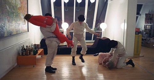 강력범죄는 죄다 등장하지만 영화는 그중에서도 알렉스의 성범죄에 무게를 둔다. 알렉스는 부부의 집에 침입하여 남편을 묶어놓고 동료들과 돌아가면서 그의 아내를 강간한다. 알렉스는 강간하면서 ‘Singing in the Rain’를 목청껏 부르는데 이 노래는 부부가 사랑에 빠졌을 때 불렀던 노래이면서 당대의 관객들 역시 낭만적인 상황에서 즐겨 부르던 노래이다. 당대의 관객들마저 절망에 빠트리는 동시에 현실과 영화는 중첩된다.
