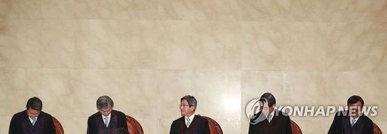 김명수 대법원장(가운데)을 비롯한 대법관들이 착석해 있다. / 연합뉴스 한종찬 기자