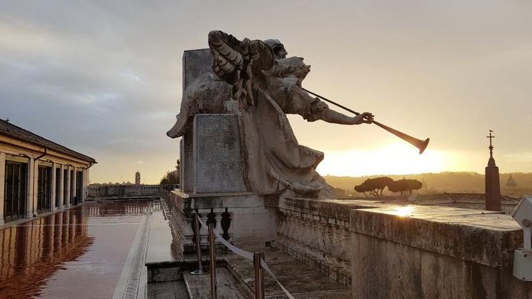 왕족의 거소이던 이탈리아 헌법재판소 옥상에서는 로마 시내가 한눈에 내려다보인다. 조각은 1735년에 만들어진 파올로 베나글리아의 작품이다. '최후의 심판 날에 나팔을 부는 천사'라는 해설도 있다. /이범준 작가 제공