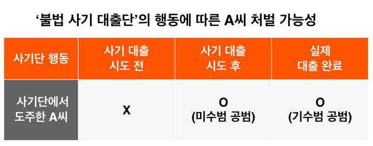 사기단이 대출을 시도한 이후라면 A씨는 처벌받을 가능성이 커진다. 사기단이 최소한 미수범으로 처벌받게 되기 때문에, A씨 역시 미수범의 공범으로 처벌받을 수 있는 것이다.