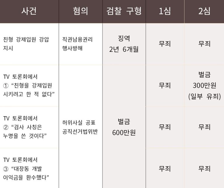 이어 "친형 강제입원에 관한 허위사실 공표 발언은 누구나 시청할 수 있는 공중파를 통해 매우 쉽게 전파됐다”면서 “이 밖에도 Δ피고인 사적이익이 전혀 없지 않은 점 Δ정치적·도덕적 비판 여지 Δ반성하는 태도를 보이지 않는 점 Δ국민 앞에 명확한 해명을 하지 않는 것으로 보이는 점 Δ과거 공직선거법 위반으로 벌금형 처벌을 받은 점 등을 고려했다”고 판단 이유를 밝혔다.