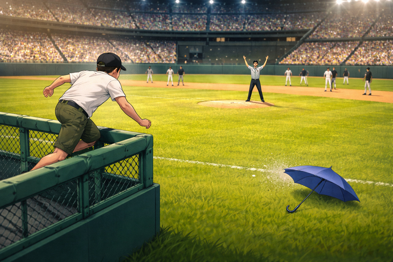 홈팀과 원정팀의 치열한 공방이 이어지던 5회 말, 갑자기 심판이 경기를 중단시켰다. 선수들의 시선이 일제히 외야석 쪽으로 쏠렸다. 그라운드 안으로 누군가 난입했기 때문이다.
