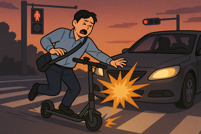 A씨는 경기도 평택의 한 건설회사에서 전기공으로 일하고 있었다. 2023년 8월 15일, 전동킥보드를 타고 퇴근하던 중 사거리에서 우회전하던 승용차와 부딪히는 사고가 났다. 이때 A씨는 보행자 신호가 빨간불인 상태에서 횡단보도로 진입했다.