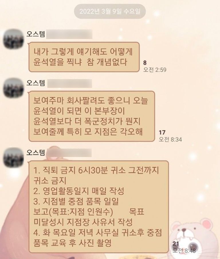 이 사건 오스템 임원 A씨는 제20대 대통령선거일이었던 지난 9일 새벽 3시쯤부터 단체 채팅방을 통해 직원 20여 명에게 각종 사내 불이익을 예고한 것으로 드러났다. 당시 국민의힘 대선 후보였던 윤석열이 당선되는 순간부터, 직원들의 퇴근을 막거나 업무 달성 여부를 따져서 매일 사유서를 쓰게 하겠다는 식이었다.
