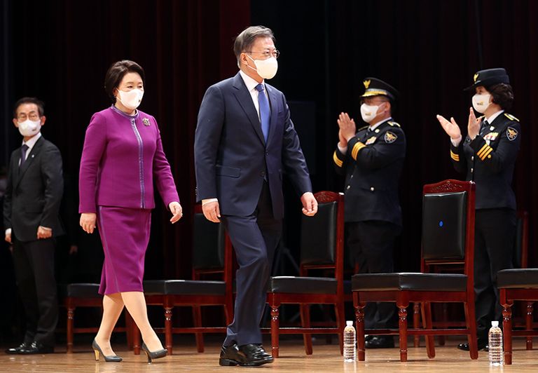 청와대가 특수활동비를 공개하라는 1심 법원의 판단에 불복해 항소한 가운데 한 시민단체가 김정숙 여사의 의전 비용 공개와 관련해 업무상 횡령 등의 혐의로 경찰에 고발했다. 사진은 지난 17일 경찰대학에서 열린 2022년 신임경찰 경위·경감 임용식에 참석한 문재인 대통령과 김정숙 여사의 모습. /연합뉴스