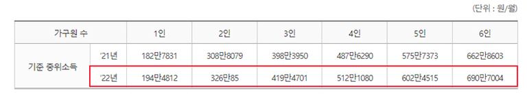 올해 기준 1인 가구 월 중위소득은 194만 4812원, 4인 가구 월 중위소득은 512만 1080원이다. 생활지원금은 가구 내 격리자가 1명인 경우 10만원, 2명 이상이면 15만원이다.
