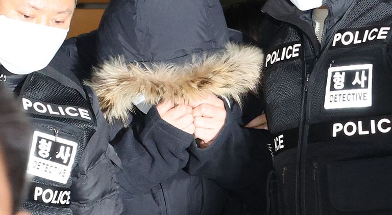 검은색 패딩 모자를 눌러쓰고 고개를 숙인 채 모습을 드러낸 A씨. 그는 "피해자와 유족에게 할 말이 없느냐"는 취재진 질문에 "정말 죄송하다"고 짧게 답했다. 이어 "범행 이유가 무엇인가" "왜 거짓 신고했느냐" 등의 질문에는 일절 답하지 않고 호송차에 올랐다.