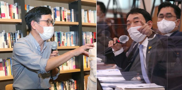 '똘마니'라는 단어로 시작된 공방이 소송전으로 비화됐다. 김용민 더불어민주당 의원(오른쪽 앞)이 진중권 전 동양대 교수(왼쪽)에게 "모욕적 언행"이라며 민사소송을 했다고 밝혔다. /연합뉴스
