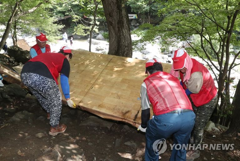 단속 요원들이 무신고 음식점 영업을 위해 계곡에 불법 설치된 평상을 철거하고 있다. /연합뉴스
