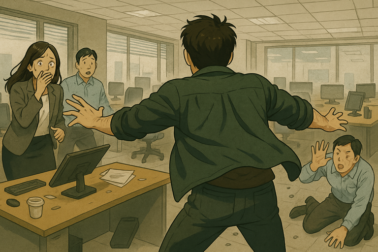 사무실 직원 B씨(여, 30세)가 A씨에게 무단으로 들어온 이유를 묻자, A씨는 돌연 B씨의 머리카락을 잡아채고 발로 몸과 머리를 가격하는 등 무차별 폭행을 시작했다. 사무실은 A씨의 고성과 함께 아수라장으로 변했다. A씨는 약 9분간 사무실과 탕비실 등을 오가며 소란을 피웠다.