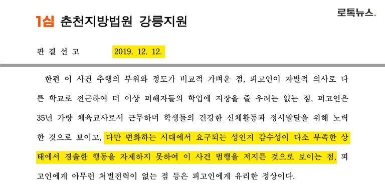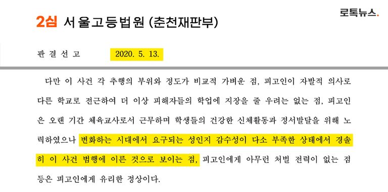 "저게 변명이냐"는 비판을 감수하면서까지 이렇게 말한 건, 다 이유가 있었다. 로톡뉴스가 취재한 결과 이를 감형 사유로 받아들여 준 판례가 존재했다. 고령의 체육 교사가 중학생 피해자들을 성추행한 사건에서 1, 2심 법원은 모두 다음과 같은 이유에서 벌금형으로 선처해줬다.