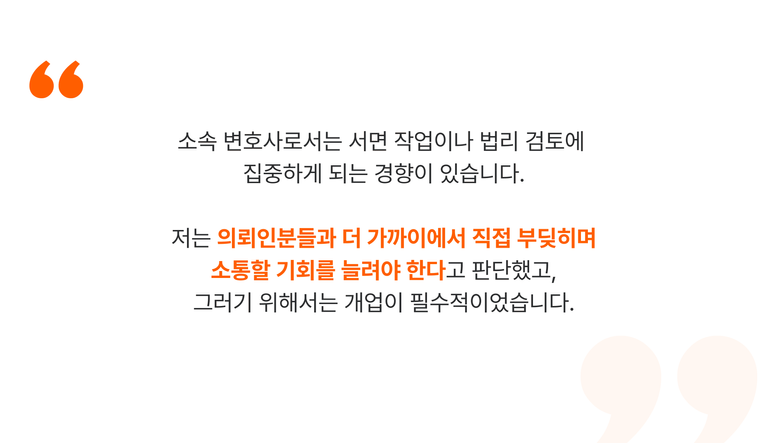 대형 로펌에서의 경험은 변호사로서 탄탄한 기반이 되었다. '언젠가 내 이름을 걸고 독립해야겠다’고 결심할 때 ‘과연 내가 업무를 제대로 수행할 수 있을까?’ 하는 불안감을 덜어주는 든든한 토대가 된 것이다.