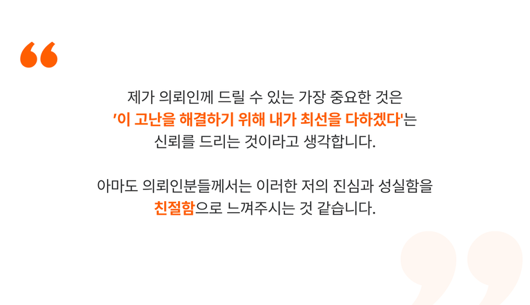 의뢰인의 인생이 걸린 문제입니다. 제 이름을 걸고 맡은 사건을 남의 손에 맡길 수는 없습니다.