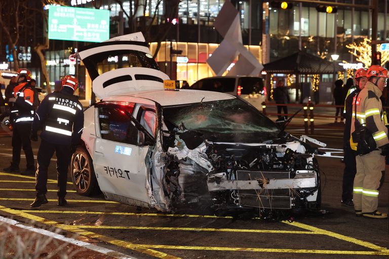 2일 오후 6시 5분께 종각역 앞 도로에서 승용차 2대와 택시 1대가 추돌하며 1명이 숨지고 9명이 다쳤다. 사진은 이날 사고 현장 모습. /연합뉴스