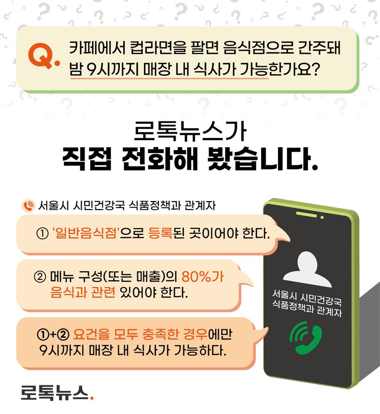 서울시 관계자는 22일 로톡뉴스와의 통화에서 "전체 메뉴 가운데 80% 이상이 식사류여야, 매장 안에서 취식이 가능한 업장으로 본다"고 설명했다. 이 기준을 충족해야 '실제로 음식을 판매하는 곳'이라 판단할 수 있다는 이유에서다.