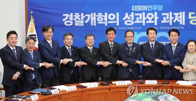 20일 오전 국회에서 '경찰개혁의 성과와 과제' 주제 당정청 협의회를 마치고 조국 청와대 민정수석, 이인영 민주당 원내대표 등 참석자들이 기념촬영을 하고 있다. (사진=연합뉴스)