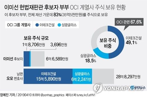 이 후보자가 인사청문위원에게 공개한 자료에 따르면, 후보자 부부는 전체 재산 42억 6000여만 원 가운데 83%인 35억 4887만 원 상당을 주식으로 보유하고 있다. 논란이 된 건 전체 보유 주식가액의 67%인 24억원가량을 코스닥 상장설이 돈 비상장 회사 군장에너지의 1·2대 주주인 이테크 건설과 삼광글라스에 투자했다는 점이다. 이 두 회사는 공정거래위원회가 상호출자제한기업집단(대기업)으로 분류한 OCI의 계열사다.