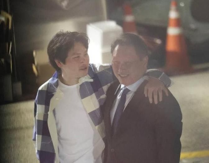 최태원 SK그룹 회장이 노소영 아트센터 나비 관장과의 이혼소송 항소심 판결 직후 장남 인근 씨와 웃으며 어깨동무하고 있는 장면이 포착돼 눈길을 끌고 있다.