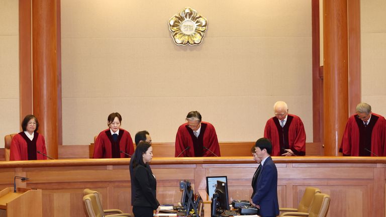 김형두 헌법재판소장 권한대행과 재판관들이 29일 서울 종로구 헌법재판소 대심판정에서 '아청법 전과자 택시기사 자격 취소' 헌법소원 심판 선고를 위해 입장한 뒤 인사하고 있다. 2025.5.29 /연합뉴스