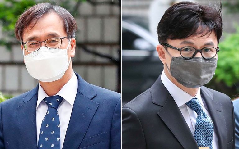 압수수색 중 한동훈 검사장을 바닥에 눕혀 폭행한 혐의를 받고 있는 정진웅 차장검사의 '독직폭행' 재판 결과가 법원의 하계 휴정기가 끝난 뒤에서야 나올 전망이다. 사진은 독직폭행 혐의를 받는 정진웅 광주지검 차장검사(왼쪽 사진)가 지난 5월 서울 서초구 서울중앙지방법원에 열린 1심 공판에 출석한 모습. 같은 날 한동훈 검사장도 증인으로 법정에 출석했다. /연합뉴스