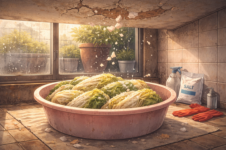- 베란다 천장 페인트가 떨어져 소금에 절인 김장 배추를 모두 버리게 됐다.