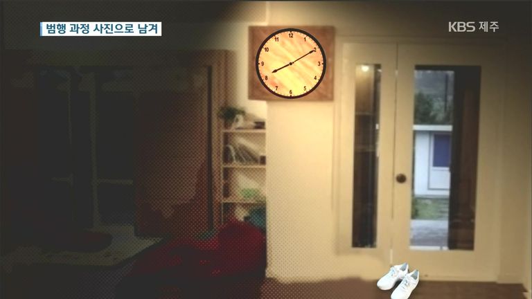 고유정은 살인 사건이 벌어진 지난 5월 25일 오후 8시 10분쯤 펜션 안에서 현관 출입문을 찍었다. 등장인물은 없다. 현관문에는 남자용으로 보이는 하얀 운동화만 놓여있었다. 펜션에 함께 들어온 고유정과 아들 신발은 없었다. 현관문 옆 벽에 걸린 벽걸이 시계도 함께 찍혔다.