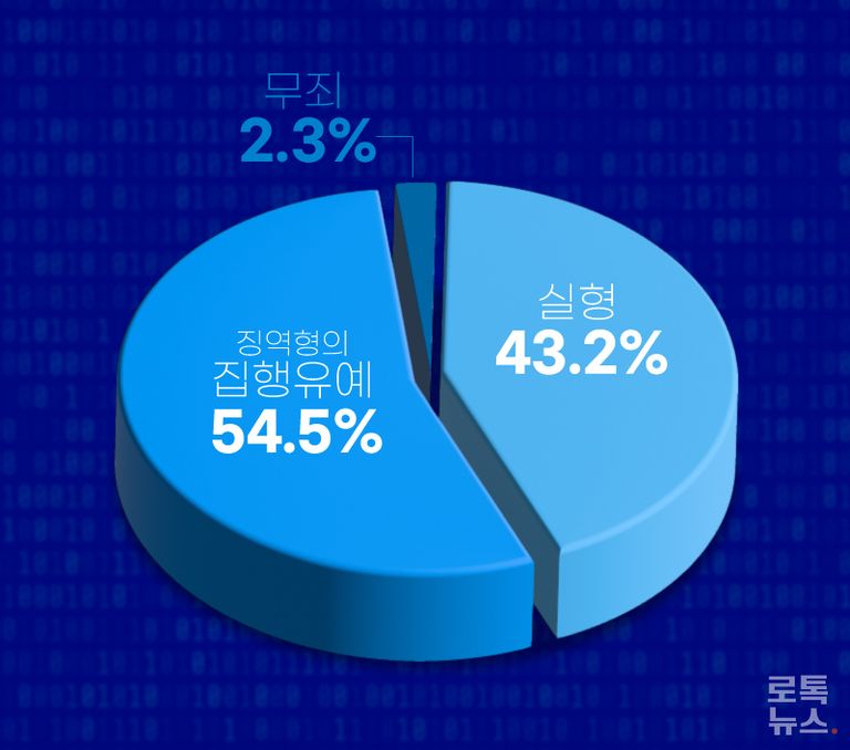 실형 선고 비율은 절반을 밑돌았다. 44명 중 19명이었다(약 43.2%). 이 경우 가장 무거웠을 때 징역 3년 6개월이었고, 평균 약 1년 7개월이었다. 그 다음으로는 징역형의 집행유예가 24명으로 가장 많았고(약 54.5%), 드물었지만 무죄 선고도 1명 있었다(약 2.3%).