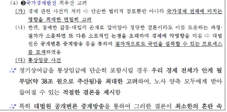 이 문건은 통상임금 사건에 대해 "정기상여금을 통상임금에 단순히 포함시킬 경우 우리 경제 전체가 안게 될 부담(약 38조원으로 추산됨)을 최대한 고려하여, 노사 양측 모두에게 받아들여질 수 있는 적절한 결론을 제시함"이라고 의미를 규정했다.