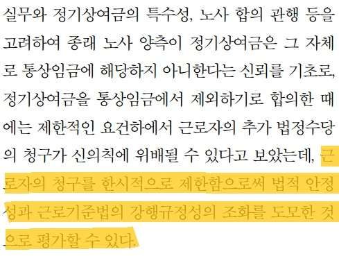 이 후보자는 이어 “정기상여금이 제외된 통상임금을 기초로 법정수당을 장기간 지급하여 왔고 이에 대하여 근로자 측에서 별다른 이의를 제기하지 않았던 것이 그간의 실정”이라며 다수의견이 내세운 ‘현실론’을 그대로 따랐다.