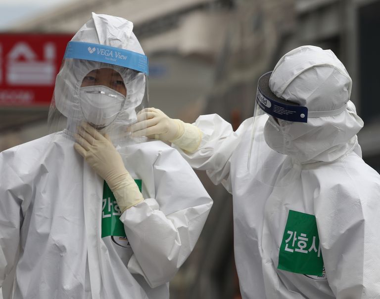 26일 오전 대구시 중구 계명대학교 대구동산병원에서 마스크와 방호복을 착용한 한 의료진이 동료의 보호장구를 점검하며 이동하고 있다. /연합뉴스