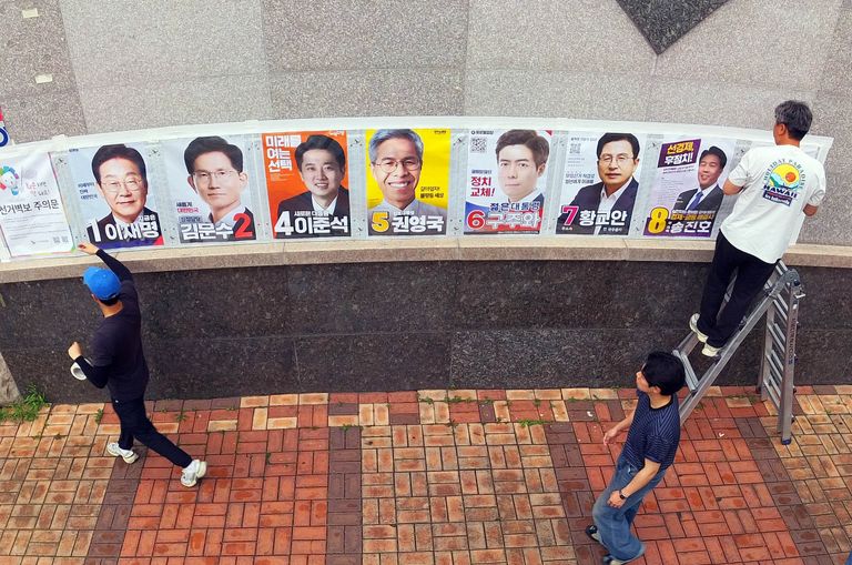 광주 북구 운암사거리 인근에서 운암1동 행정복지센터 직원들과 관계자들이 후보자들의 벽보를 붙이고 있다. /연합뉴스