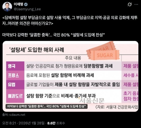 28일, 이 대통령은 자신의 엑스(X·옛 트위터)를 통해 화두를 던졌다. "담배처럼 설탕 부담금으로 설탕 사용을 억제하고, 그 부담금으로 지역·공공 의료 강화에 재투자하는 방안에 대해 어떻게 생각하십니까"라는 질문이었다.