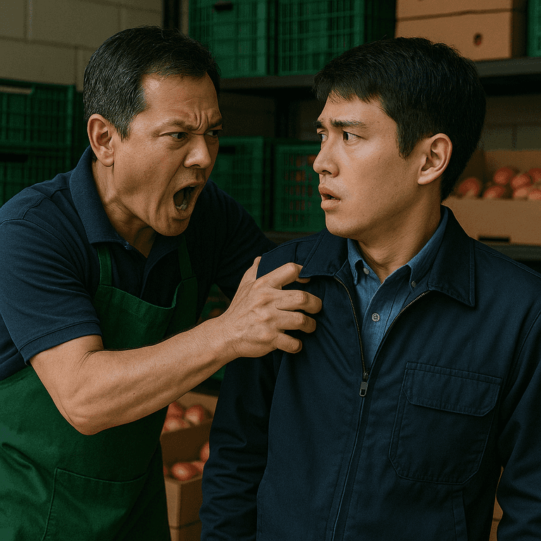사건의 발단은 아르바이트 현장에서 벌어진 사소한 갈등이었다. 10살 많은 선배 직원은 후배의 말투가 "싸가지 없다"며 소리를 지르기 시작했다. 분이 풀리지 않은 듯, 옆에 쌓여 있던 사과 상자를 팔로 쳐 넘어뜨리며 위협적인 분위기를 조성했다. 대화를 피하려던 후배의 어깨를 거칠게 잡아 돌려세우기까지 했다.
