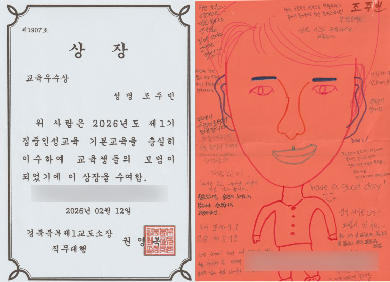 징역 47년을 확정받고 복역 중인 텔레그램 '박사방' 주범 조주빈이 대리인을 통해 자신의 외부 블로그에 공개한 '교육우수상' 상장(왼쪽)과 동료 수형자들의 응원 메시지가 담긴 롤링페이퍼. /조주빈 블로그