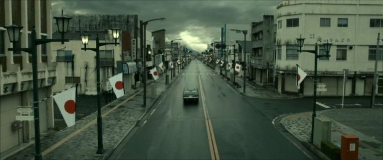 유괴된 여자아이가 숨진 채로 발견된 쇼와 64년 1월 7일 히로히토 천황도 죽었다. 조기가 걸린 도로를 범인 검거에 실패한 경찰들이 지나고 있다. / TOHO