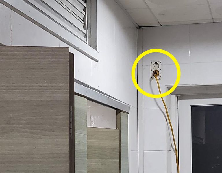 공중화장실 옆에 바짝 붙어선 캠핑카. 자세히 보니 화장실 안 콘센트에 전기선을 꽂고 몰래 전기를 끌어다 쓰는 중이었다.