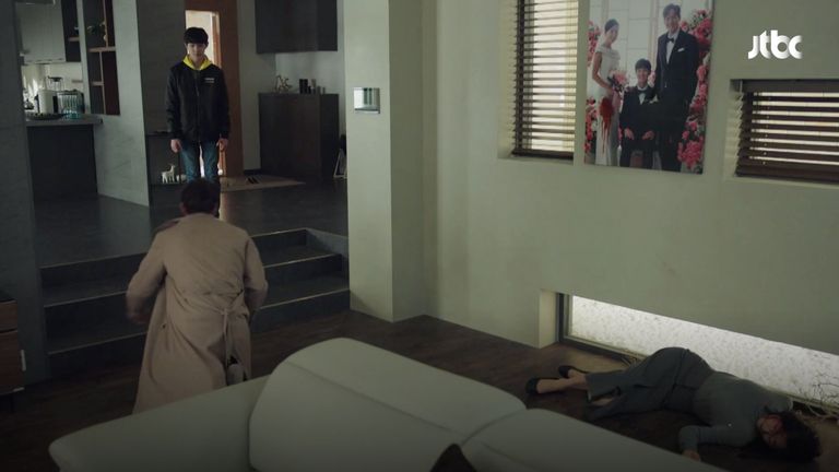 드라마 속에서 김희애는 거짓말로 남편의 폭행을 유도하고, 이를 아들이 보게 했다. 아들이 자신을 선택하게 하기 위한 의도된 행동이었다. /JTBC캡처