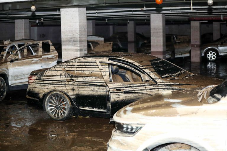 10일 광주 북구의 한 아파트 단지의 100여대의 차량이 지하주차장을 매운 물이 이틀 만에 빠져 진흙이 잔뜩 묻은 차량의 모습이 드러나고 있다. /연합뉴스
