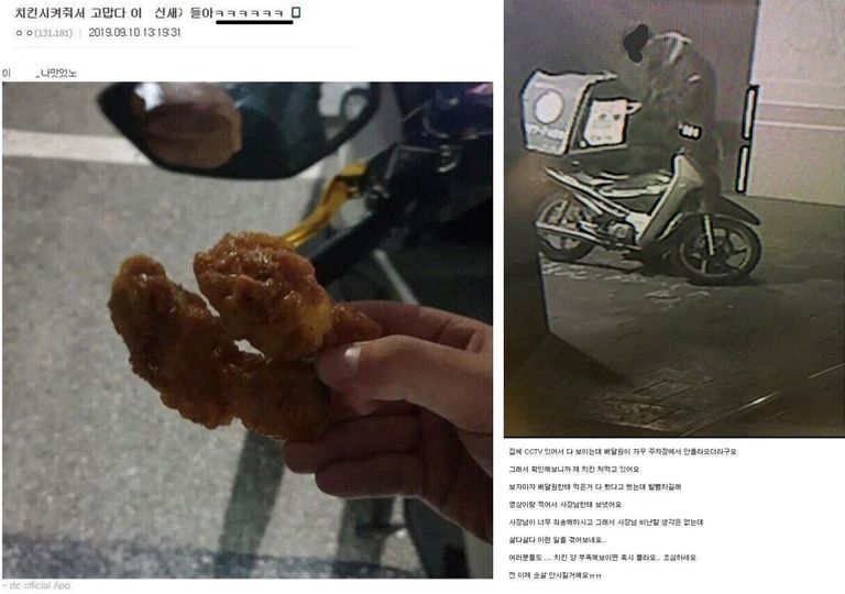 지난달 한 인터넷 커뮤니티에 닭다리 두 개를 손에 쥔 사진이 올라왔다. 치킨 뒤로는 배달 오토바이가 배경으로 잡혔다. 이 사진에는 "치킨 시켜줘서 고맙다 이 병X 새X들아"는 제목이 달렸다.