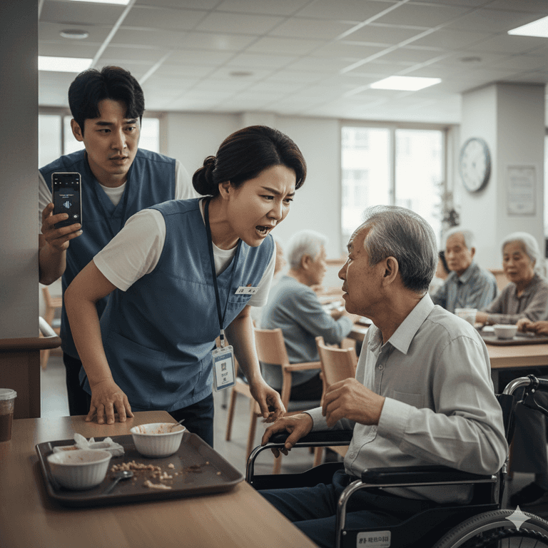 요양원에서 식사를 보조하던 직원이 어르신에게 막말을 쏟아냈고, A씨는 이를 노인학대라 판단하고 스마트폰으로 녹음했다./제미나이 생성 이미지